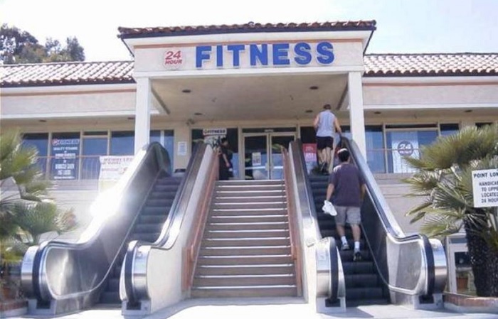 (12) Van azért abban némi irónia, hogy egy edzőterem mozgólépcsőt szerel fel a bejárat elé, és a sportolni igyekvő vendégek azt használják a sima lépcső helyet.