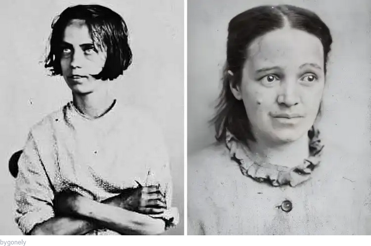 A bal oldali képen Harriet Jordan látható, aki 1858-ban akut mániával került kórházba, míg a jobb oldali képen egy ismeretlen nő látható, aki akut melankóliában szenved.