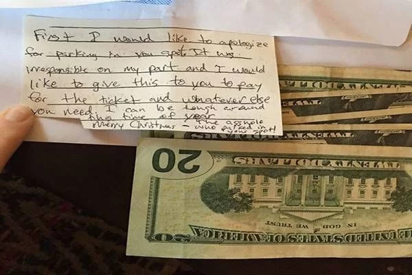“Elnézést kérek, mert elfoglaltam a parkolóhelyed, rosszul döntöttem. Fogadd el kérlek ezt a 100 dollárt, hogy kifizessem a büntetésed, illetve költsd arra, amire szükséged van. Boldog karácsonyt!”