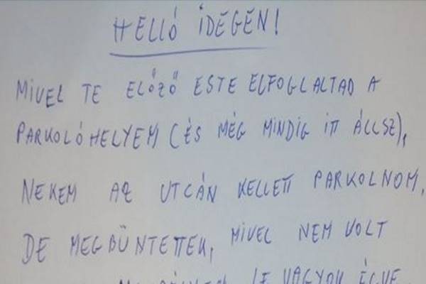 “Helló, idegen. Mivel este elfoglaltad a parkolóhelyem (amelyen még mindig állsz), az utcán voltam kénytelen parkolni, de megbüntettek, mivel nem volt rá engedélyem. Le vagyok égve. Mivel ez a hely magánparkoló, elvontathatnálak. Nem foglak, de kérlek, hogy többet ne parkolj a helyemre.”