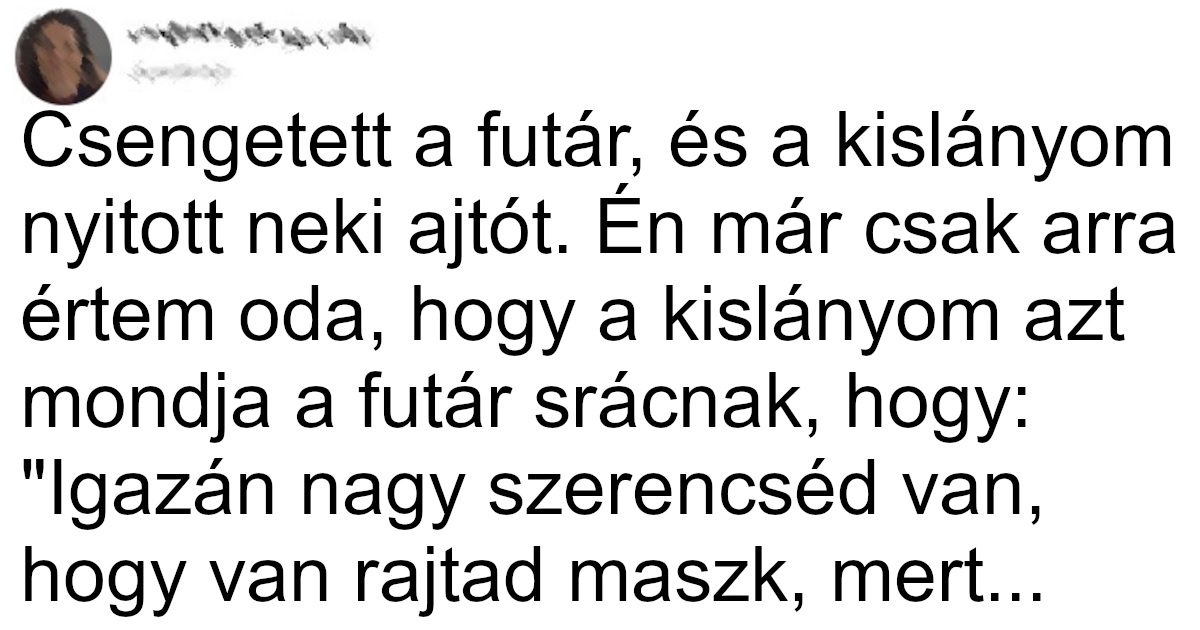 10. Csengetett a futár, és a kislányom nyitott neki ajtót. Én már csak arra értem oda, hogy a kislányom azt mondja a futár srácnak, hogy: „Igazán nagy szerencséd van, hogy van rajtad maszk, mert anya éppen az előbb púzott egy nagyot.”