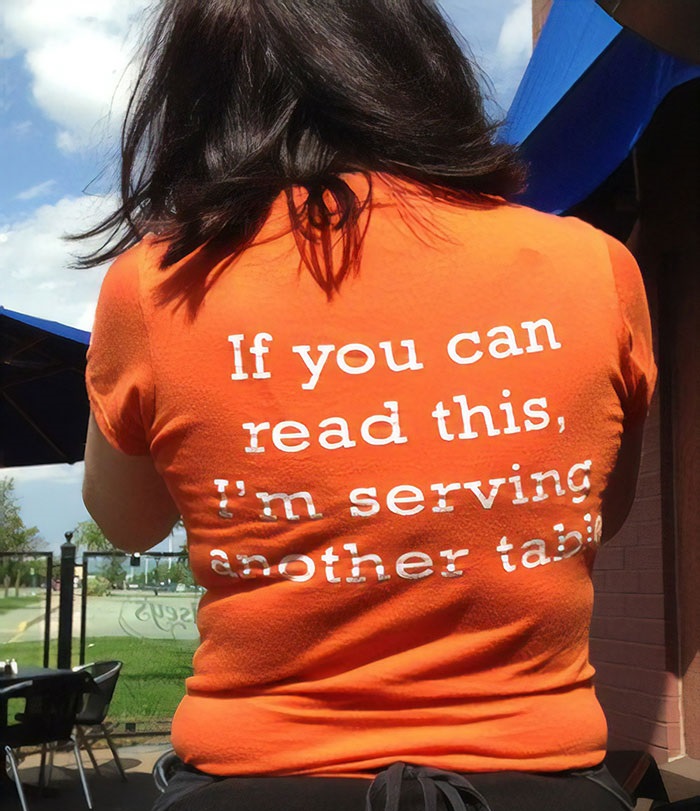 13. A pincérnő pólójára ez a szöveg volt ráírva: „Ha ezt el tudod olvasni, akkor éppen egy másik asztalt szolgálok ki.”