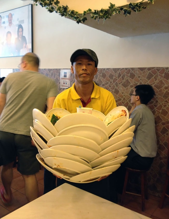 14. Beültünk egy étterembe ebédelni, ahol a pincér így szedte össze a tányérokat az asztalokról: